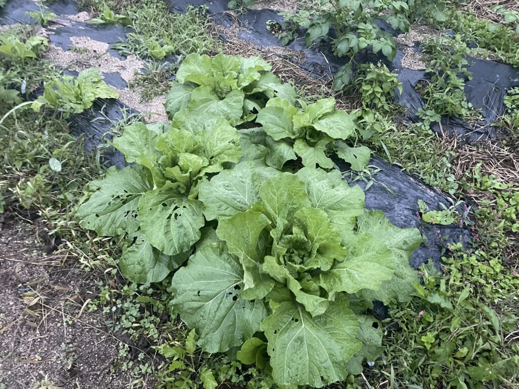 白菜が大分大きくなってきました。外側の葉は虫に食われた跡がありますが。コオロギでしょうか、はたまたヨトウ虫でしょうか。とりあえずここまで大きくなってくれたら一安心です。畑2号の白菜は小さい葉のうちから虫に食われてほぼ全滅状態ですので。生き残った数株が今後どうなるかは楽しみではありますが。とりあえず、こちらの白菜はこのまま温かく見守りましょう。