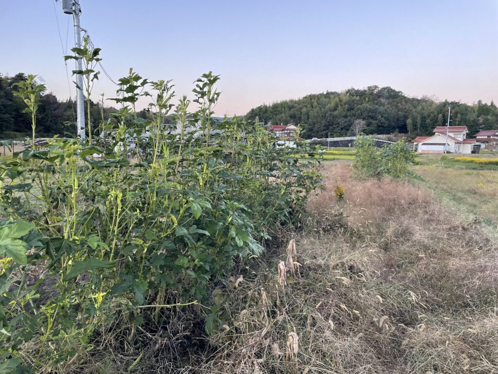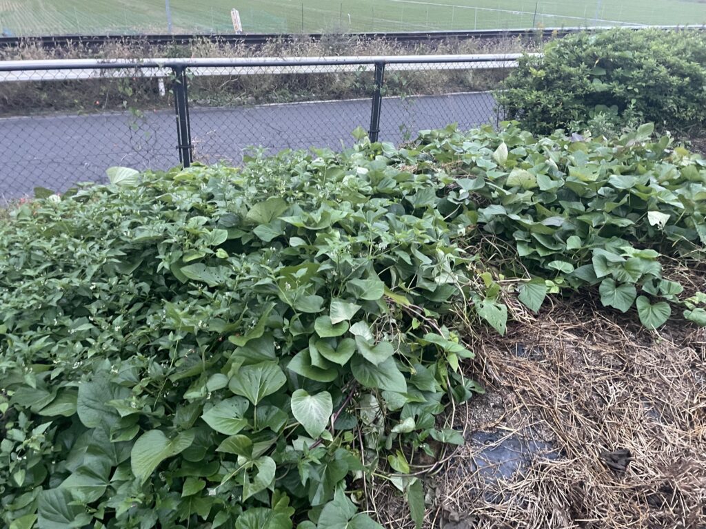 そして最後にサツマイモ。なんだか、葉っぱが11月に入っても若々しいですし、更にツルを伸ばして四方八方に伸びていますね。周りの畝にも侵食してきています。うーむ、やりすぎ感はありますね。毎年思うのですが、サツマイモの収穫時期ってわからないですよね!?こんなにまだ葉が青々としているけど良いのだろうか。はたまた、この若いうちに収穫すべきなのだろうか。他の畑では既に収穫されているところもあります。今年は試にそろそろ収穫してみるか。。