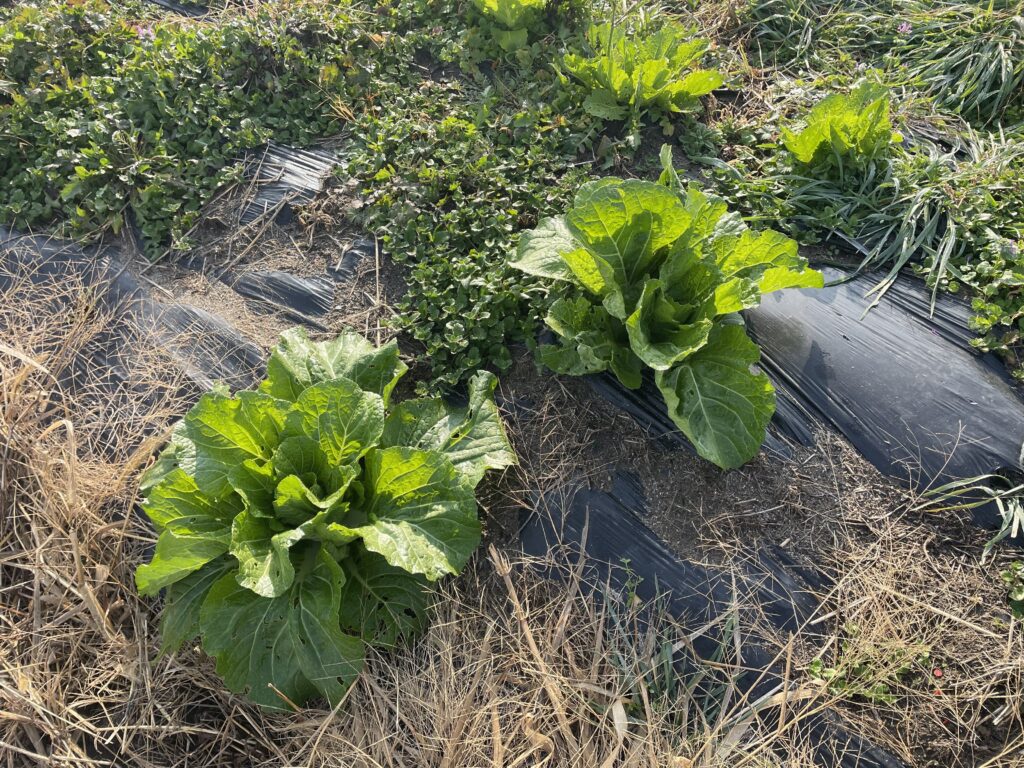 As for the Chinese cabbage, it’s not growing well… I planted a lot, but only the two plants in the photo barely made it. The others are small and probably won’t grow to a normal size. Hmm, what went wrong? I used only leaf mold as fertilizer, but maybe that wasn’t enough. Even so, I spread the leaf mold and mulch before summer, then left it untouched for three months to prepare the soil… Maybe I needed twice the amount of leaf mold I applied. This time, I spread roughly 2.5kg of leaf mold per square meter. Was that too little?